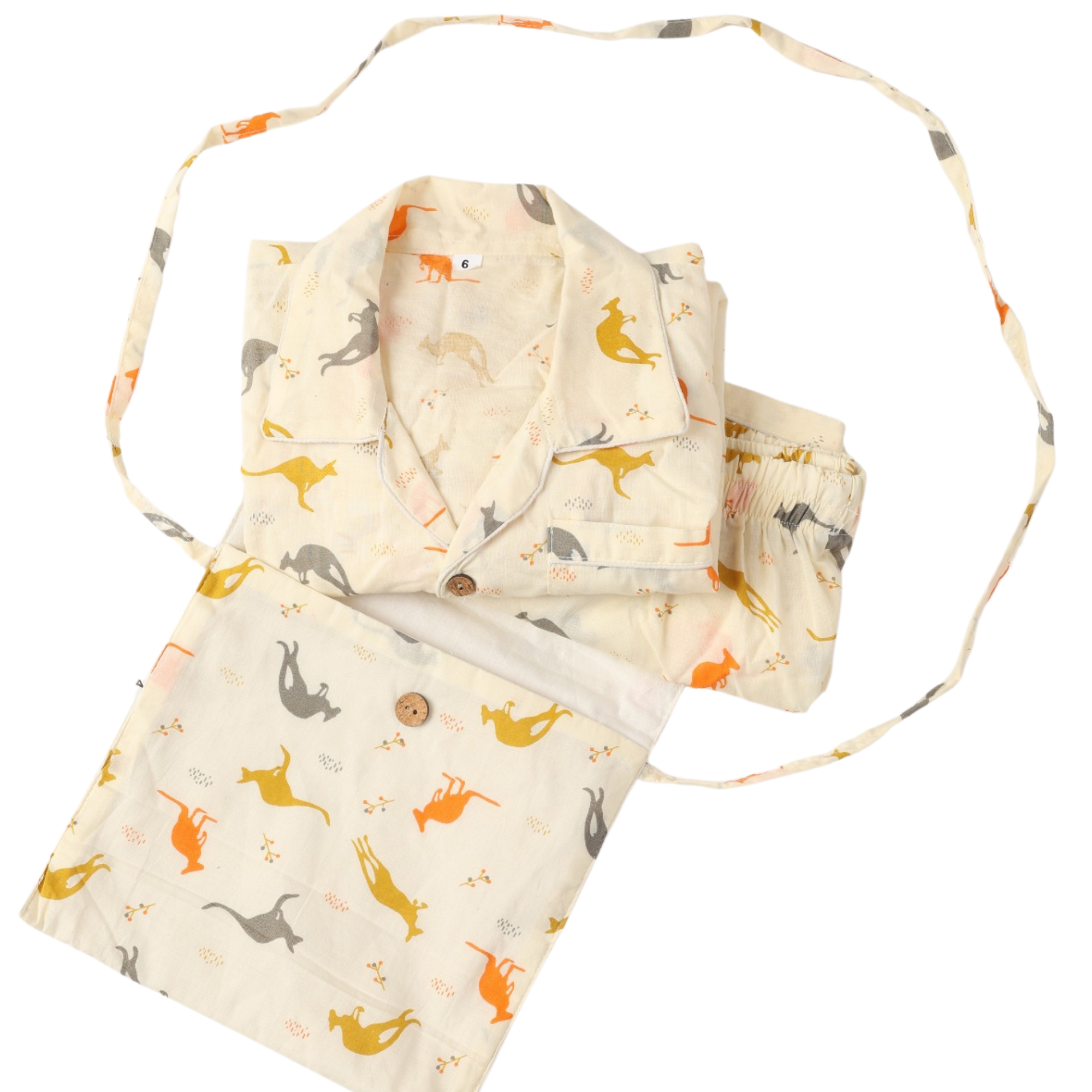 The cream background in this pure-cotton kids sleepwear/ night suit is playfully decorated with a pattern of Cute Kangaroos.