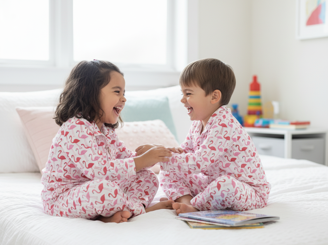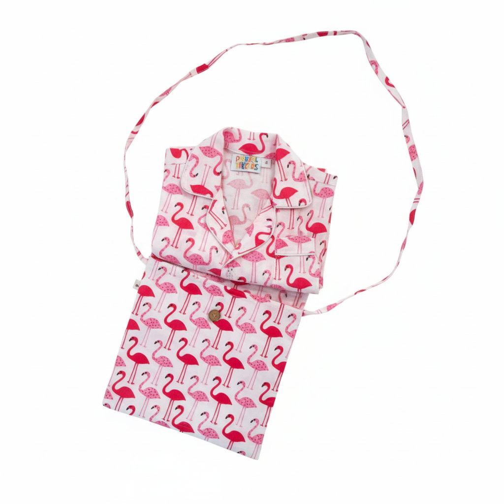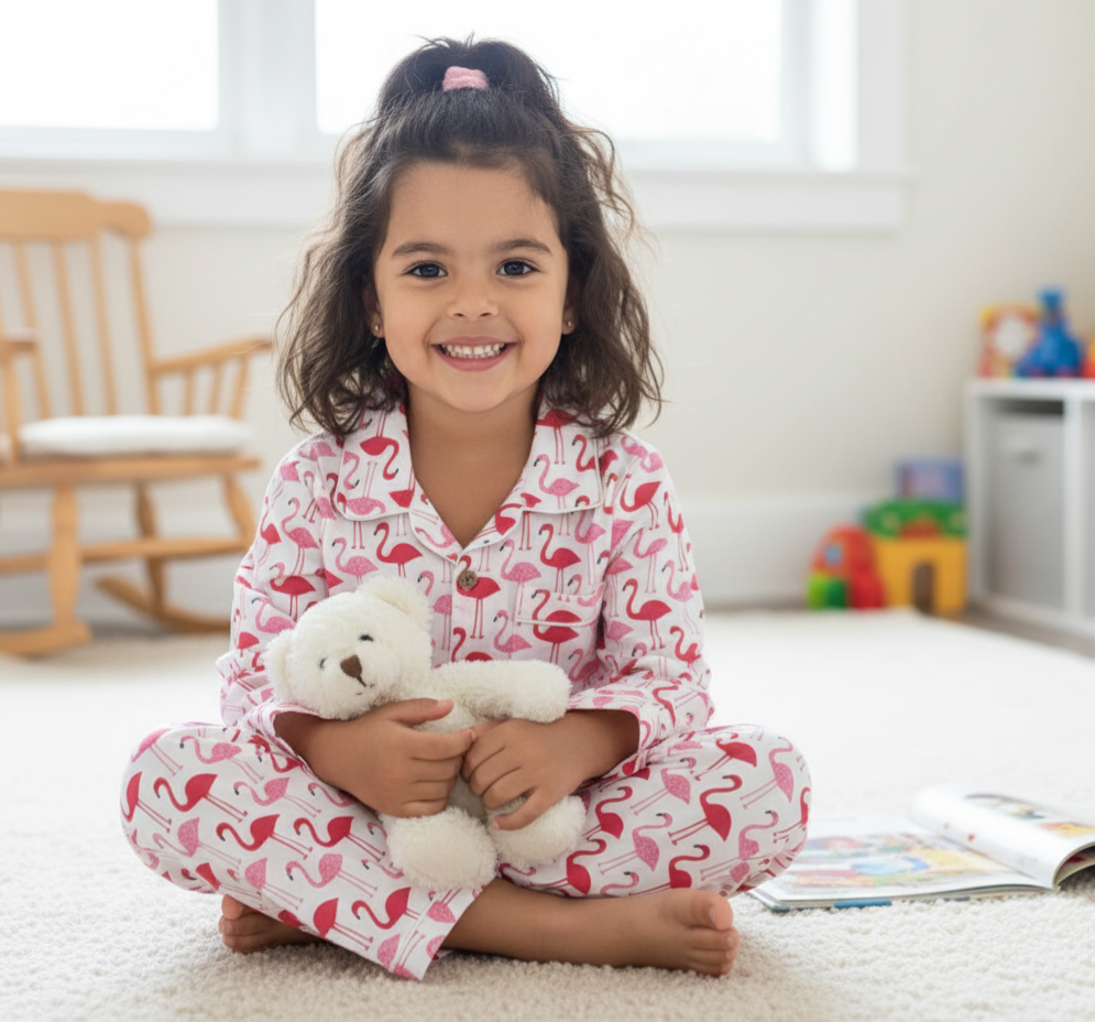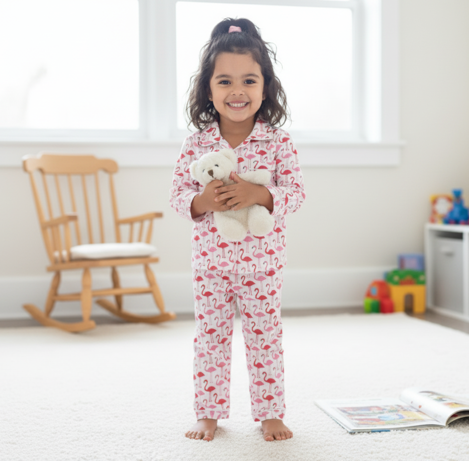 Drift off to dreamland in our adorable Snoozy Flamingos Night Suit, designed for ultimate comfort and playful style! This delightful two-piece pajama set features a vibrant all-over print of cheerful pink flamingos on a crisp white background, bringing a touch of tropical whimsy to bedtime.