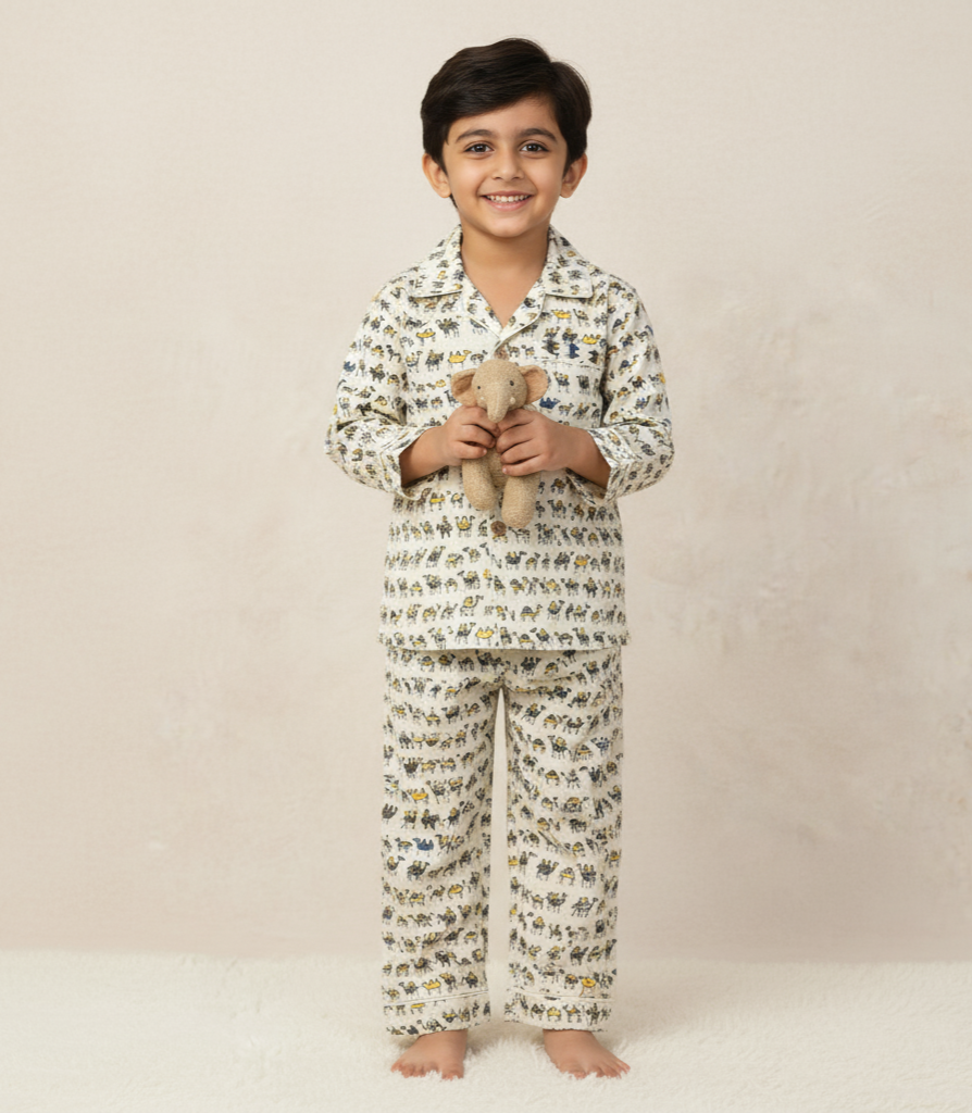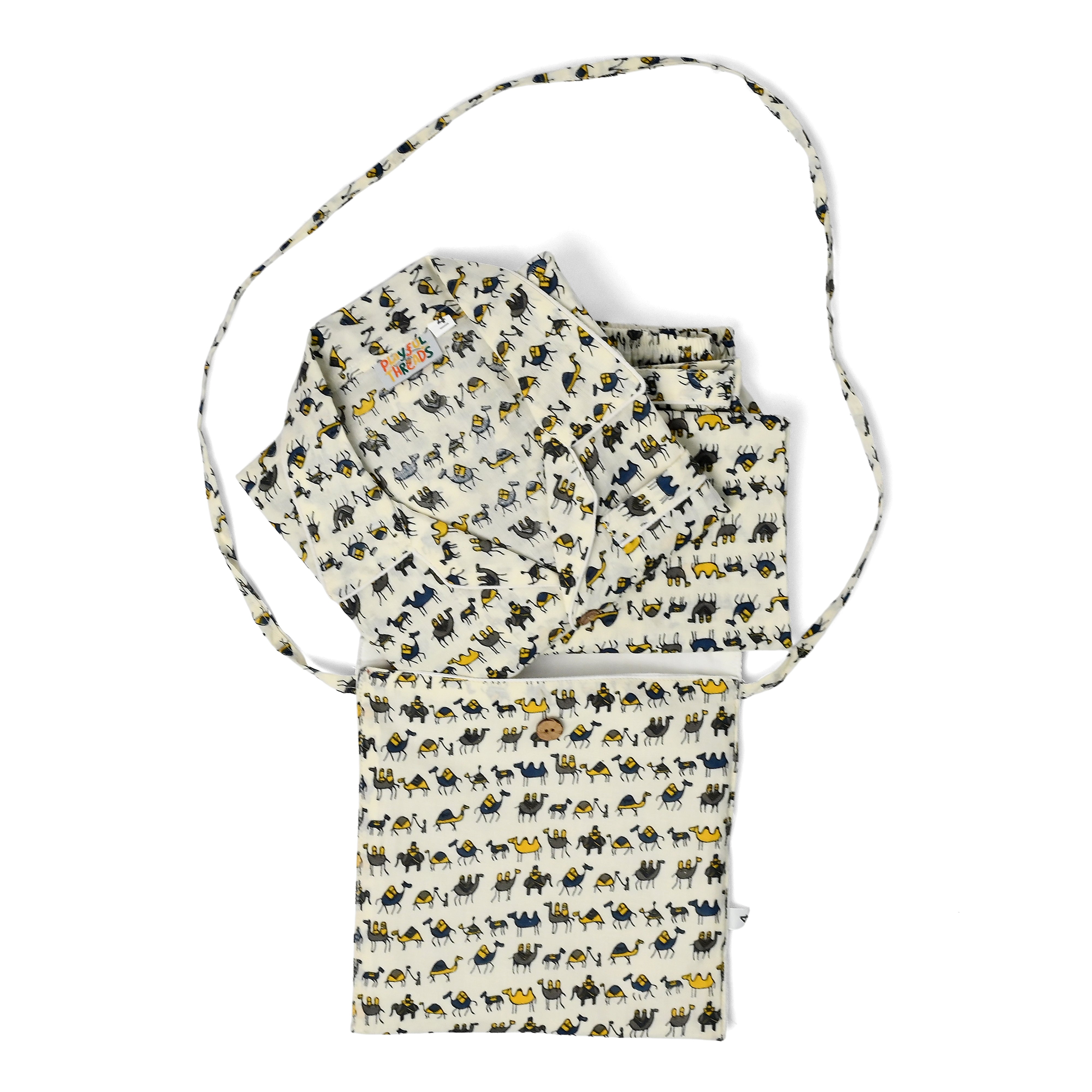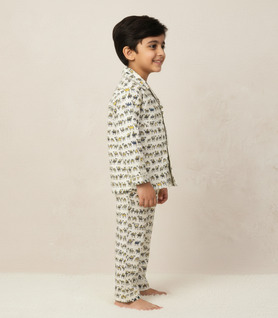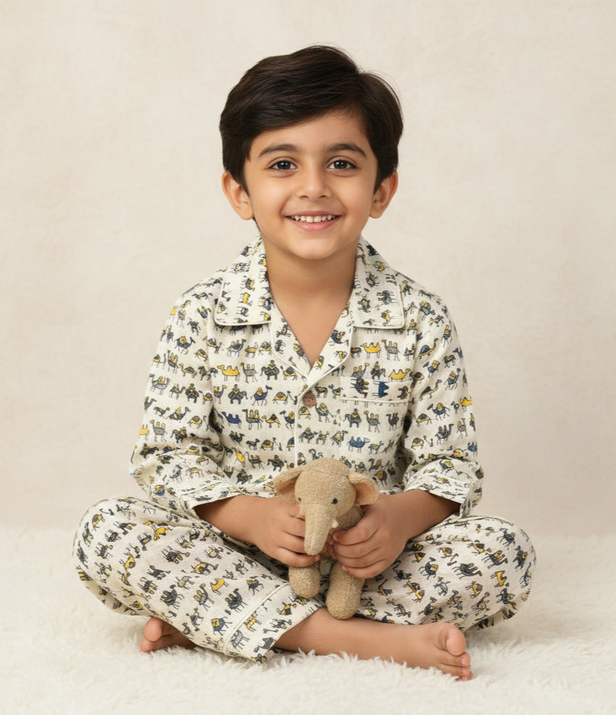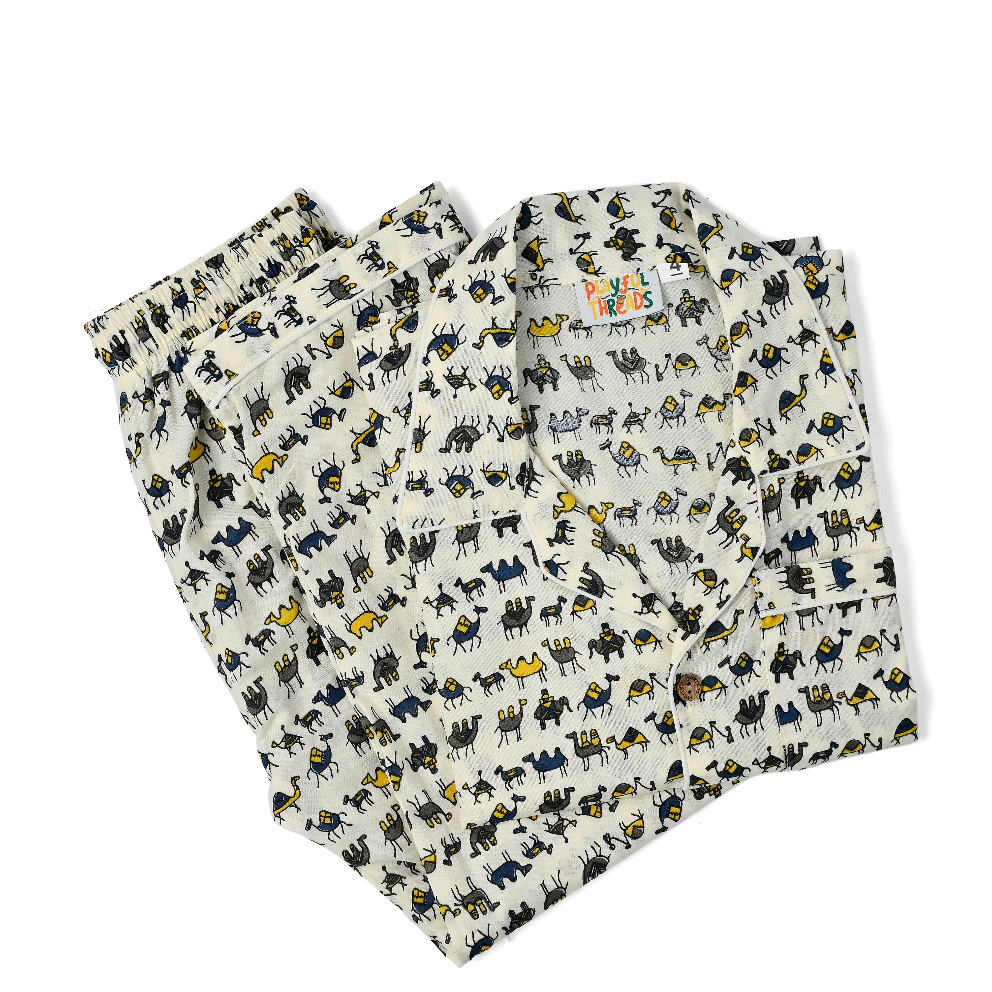Embark on an adventure every bedtime with our enchanting Caravan Dreams Night Suit Set! This charming two-piece pajama set features a whimsical, detailed print of camels, travelers, and perhaps tiny treasures, all set against a soft, neutral background.