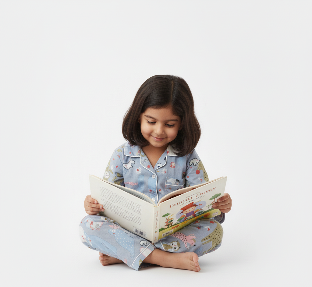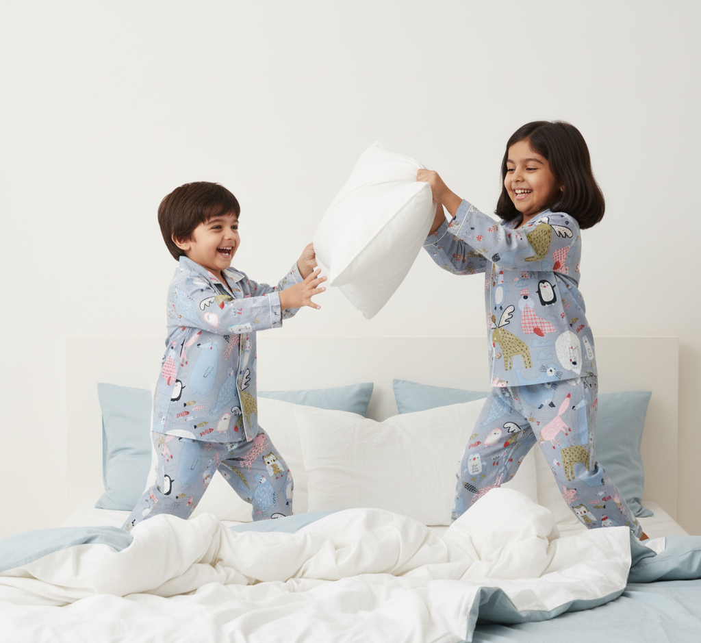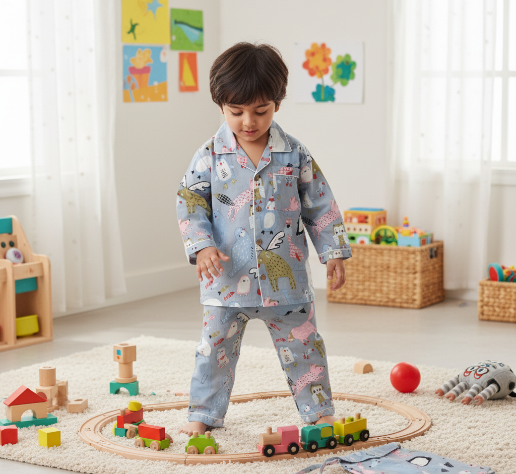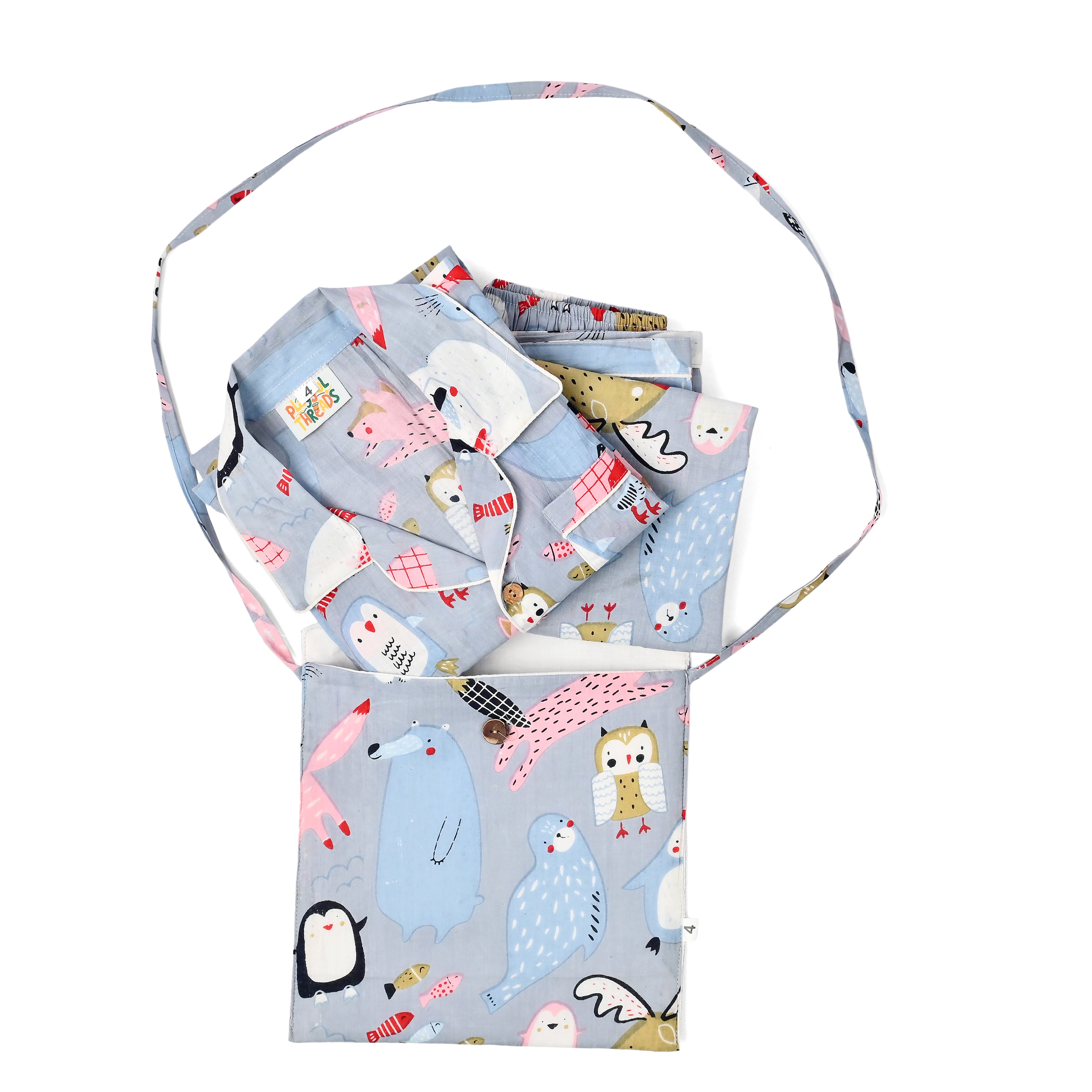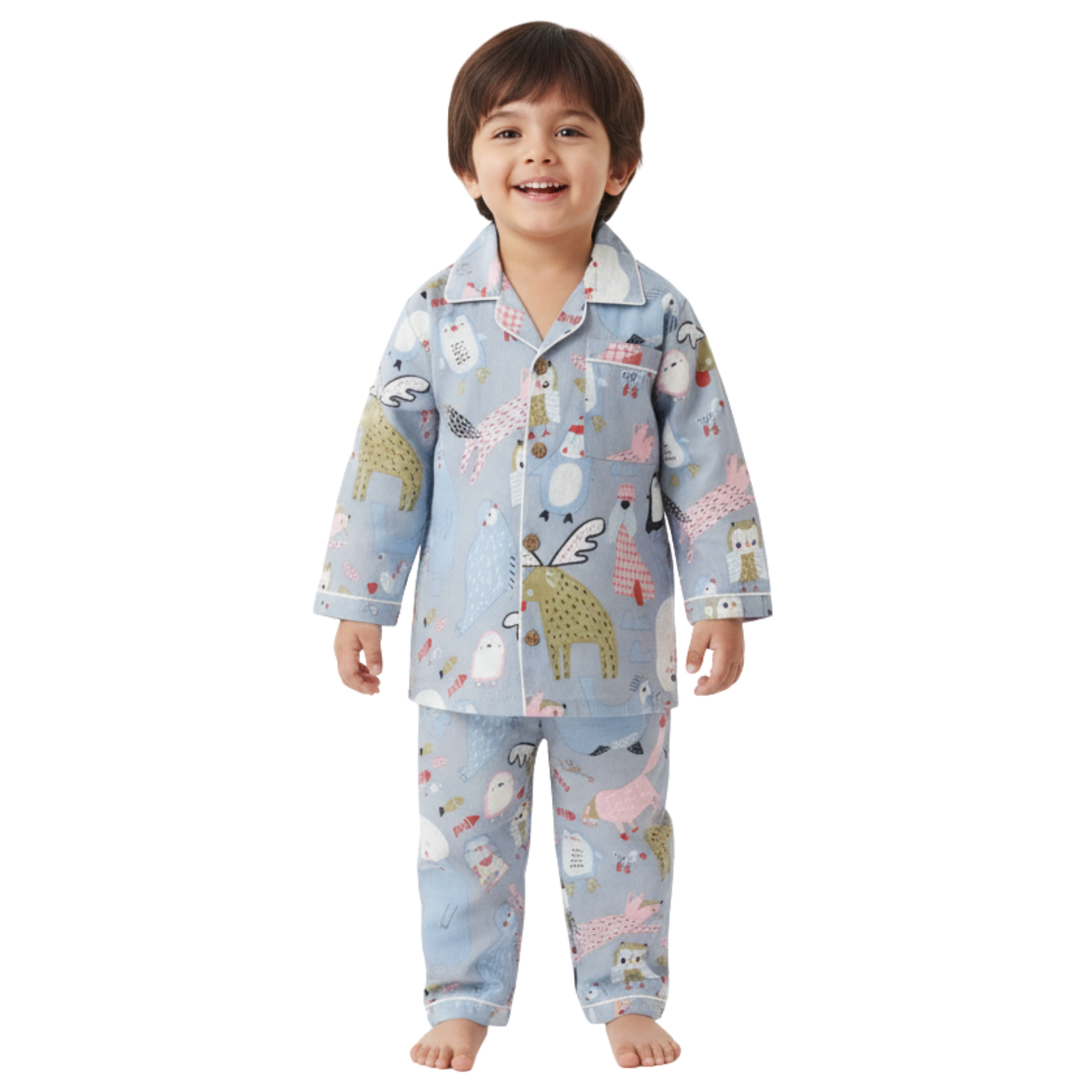 Wrap your little one in comfort with our pure cotton whimsical Frosty Friends Night Suit Set. This adorable two-piece pajama set features a delightful all-over print of colorful, quirky Arctic animals like playful polar bears, festive reindeer, and sweet penguins.