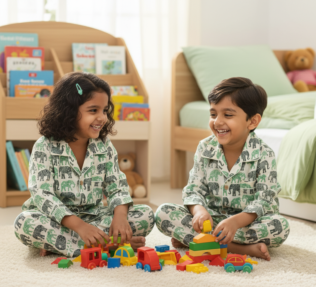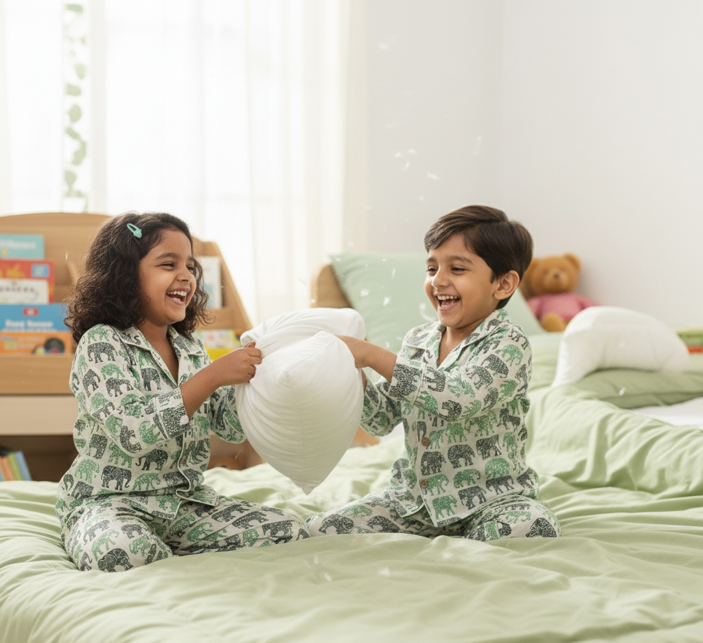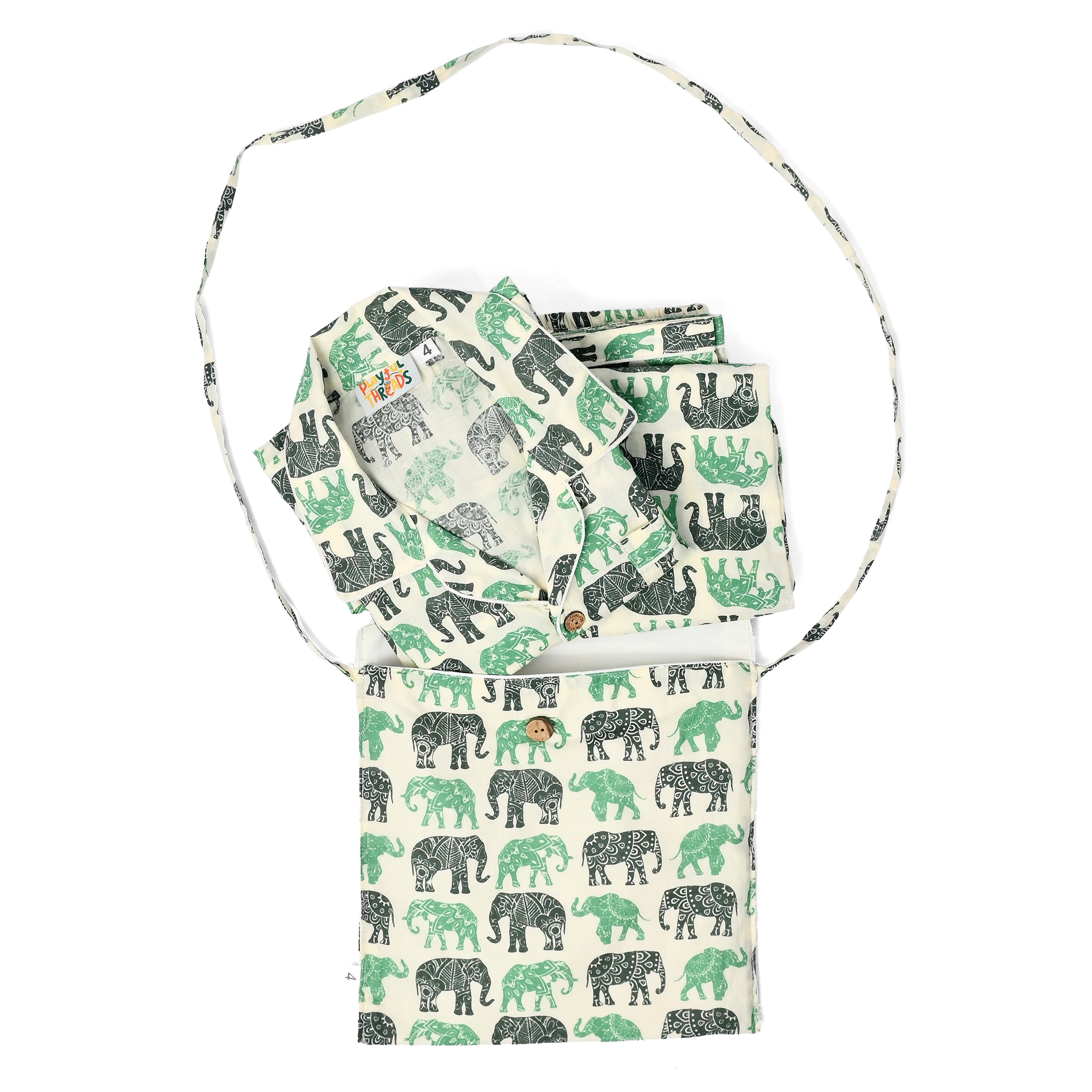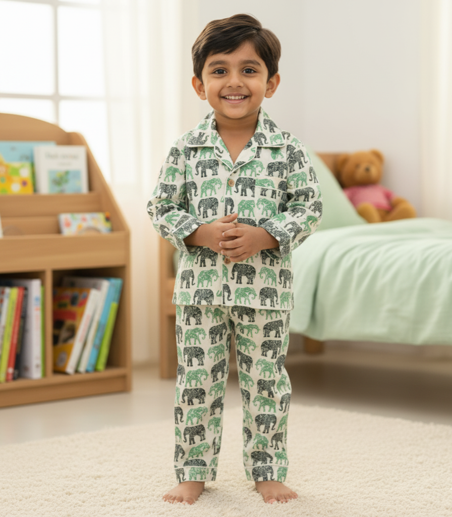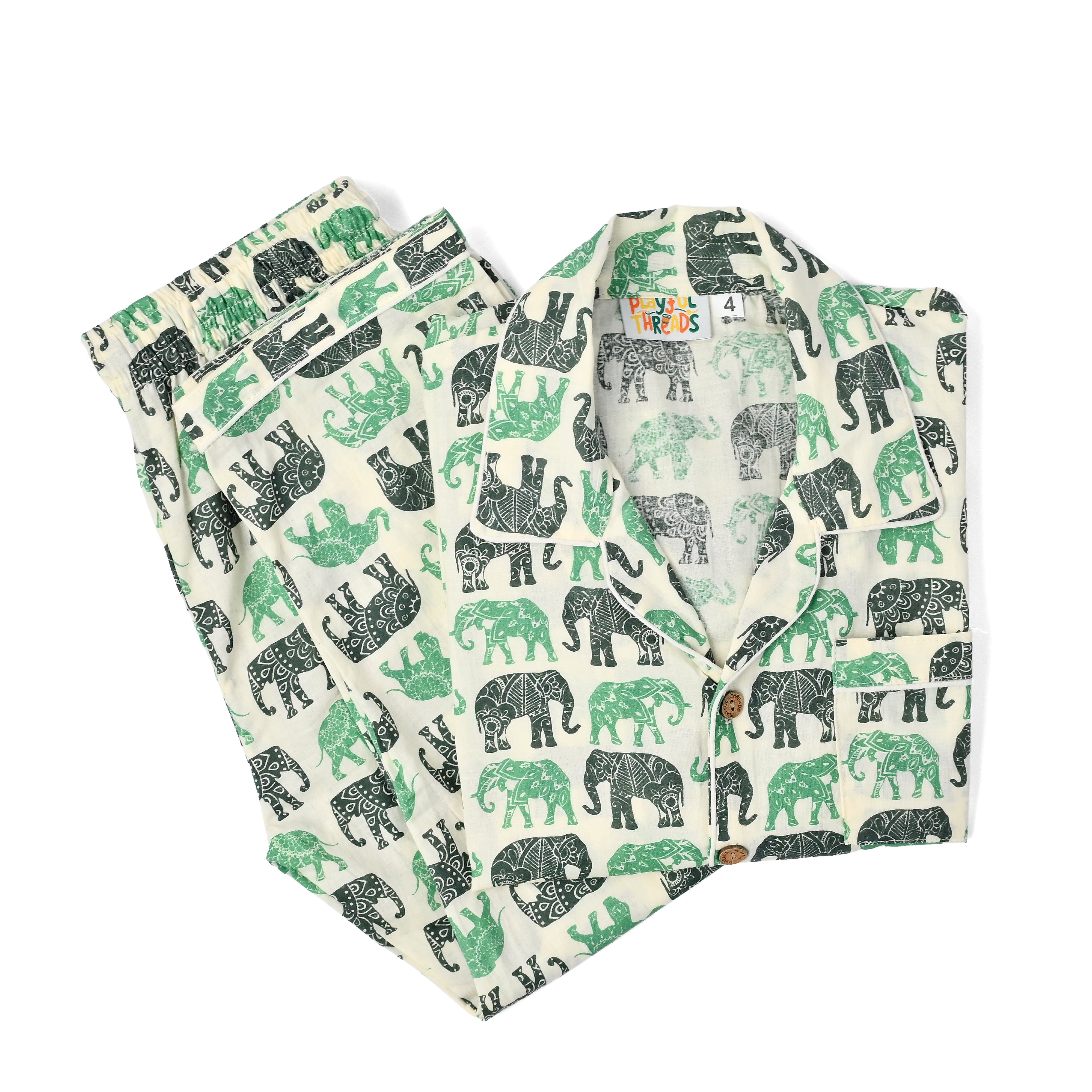 Let your child dream big with our sweet Gentle Giants Night Suit Set. This comfortable pajama set features a timeless design with an all-over print of adorable elephants in soothing shades of forest green and charcoal grey on a creamy white base.