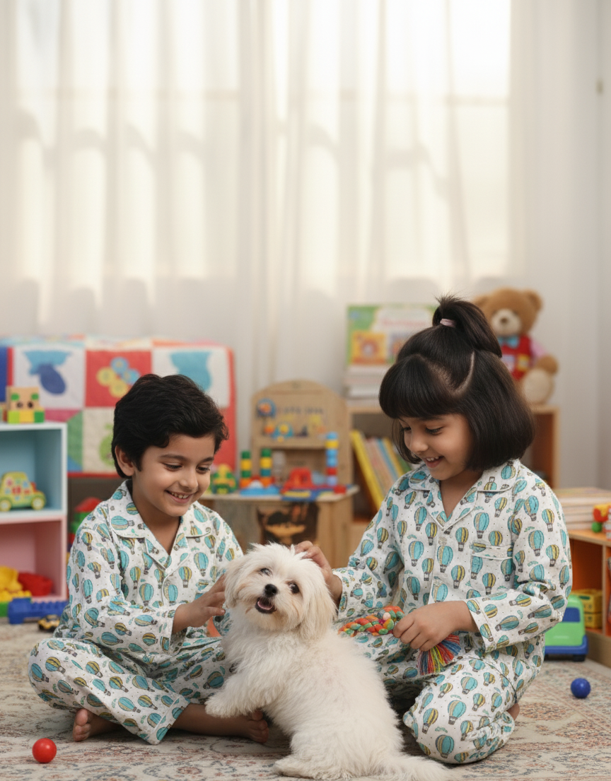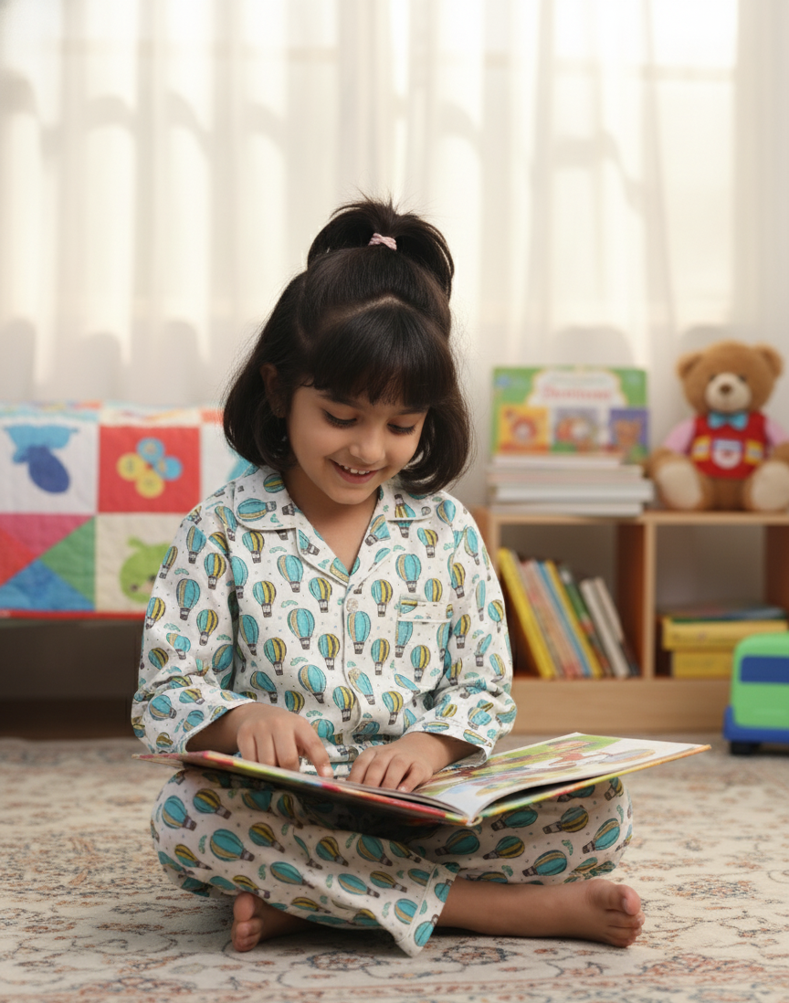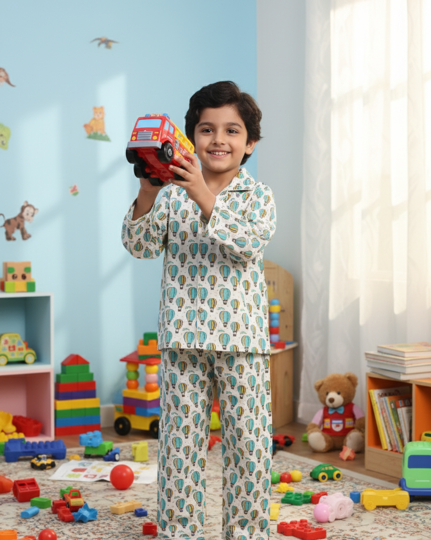 Up, Up and Away - Drift off to dreamland in style with our charming Hot Air Balloon Night Suit Set! This classic pajama set features a whimsical all-over print of colorful hot air balloons in lovely shades of teal, yellow, and beige on a creamy white base.