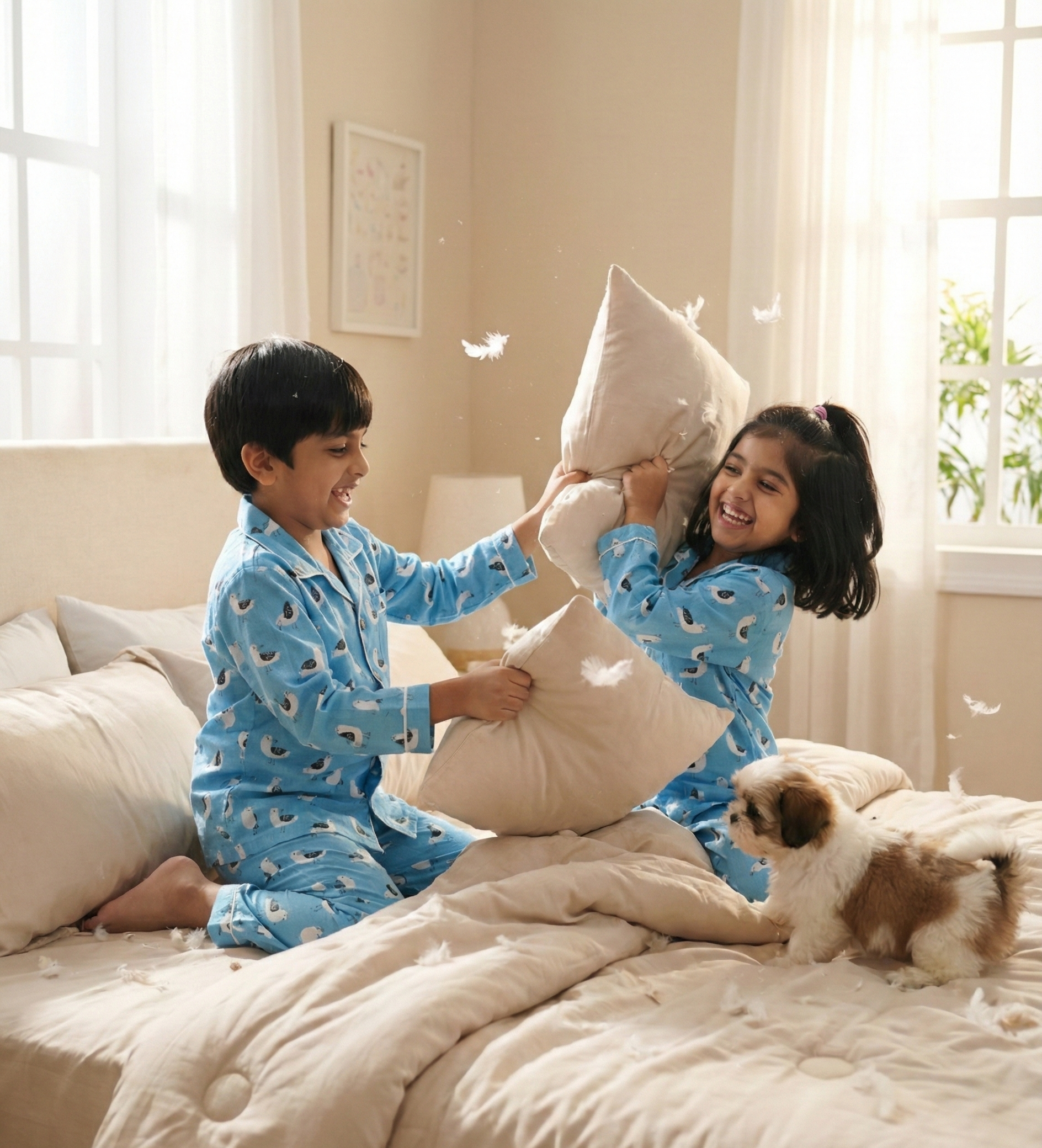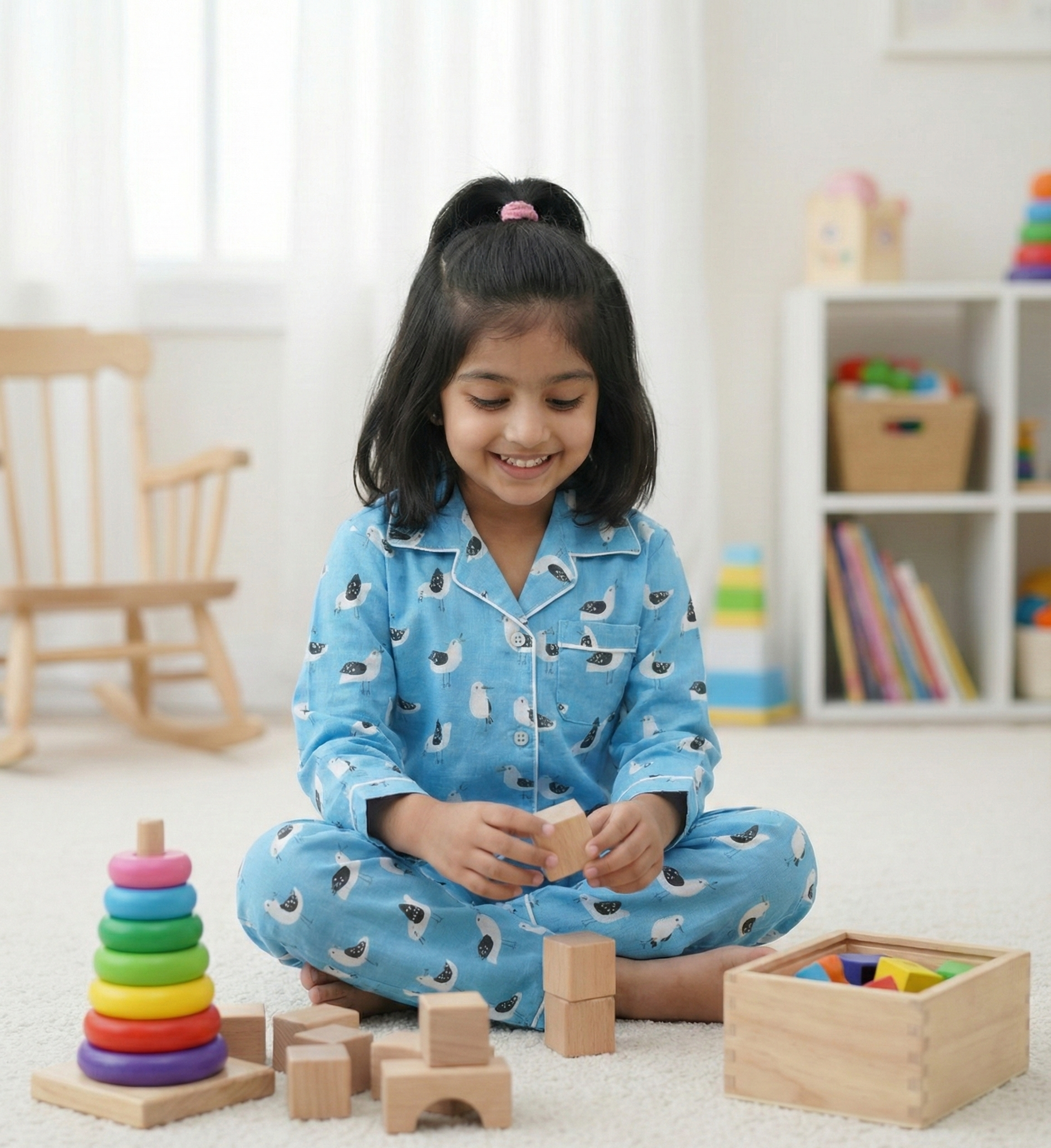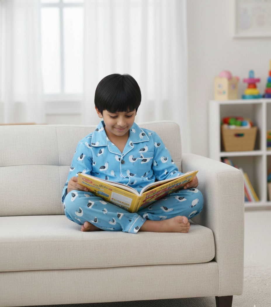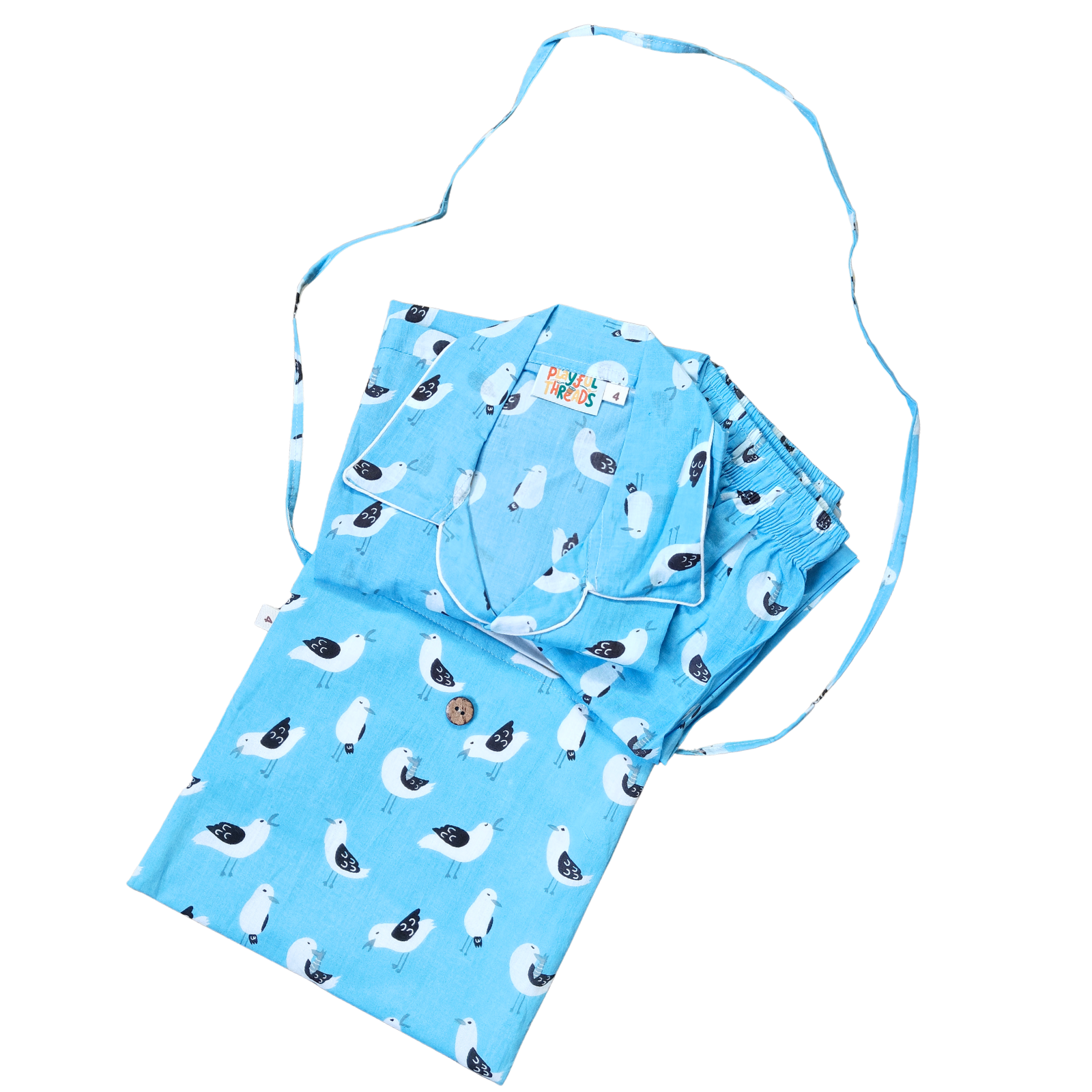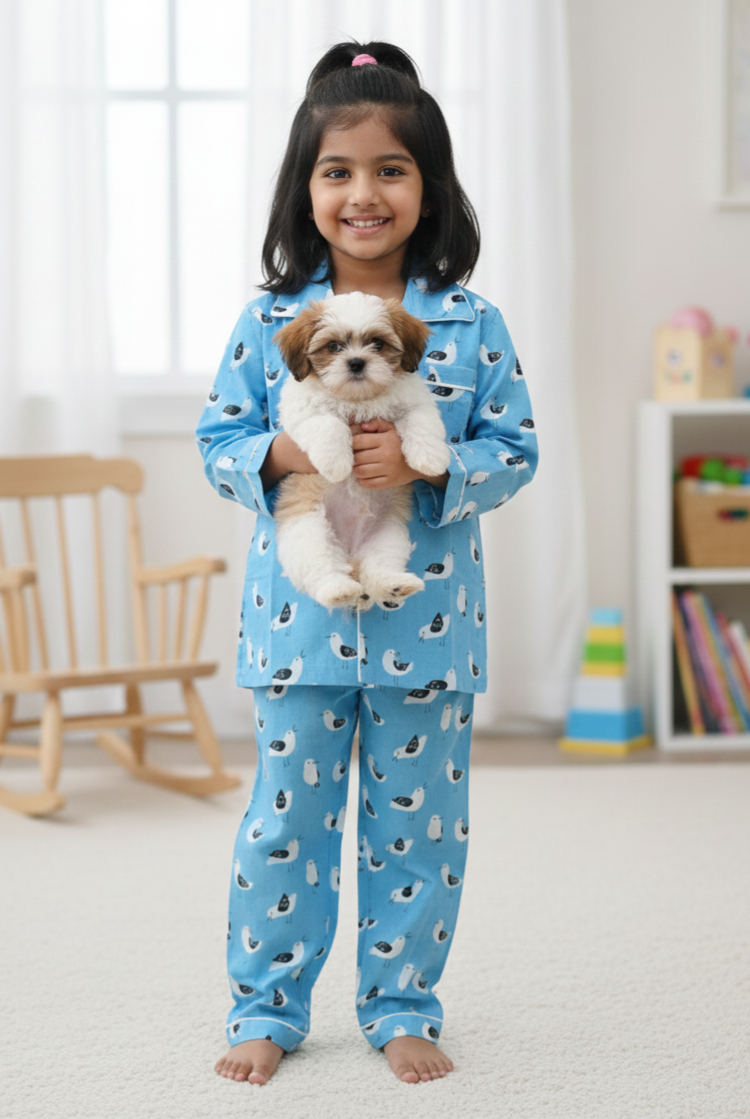 Drift off into a sea of sweet dreams with our Mariner’s Dream Night Suit. Crafted for little explorers who love comfort as much as adventure, this breezy blue set features a whimsical seagull print that captures the joy of the ocean. Whether they are building pillow forts or curling up for a bedtime story, this set ensures they do it in style.