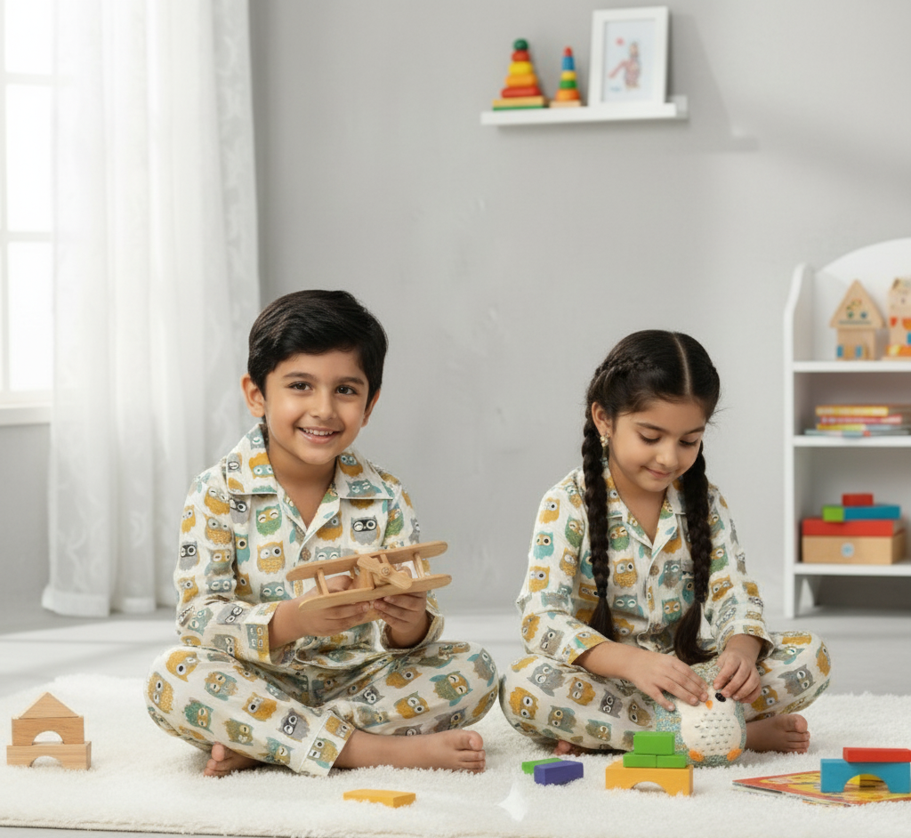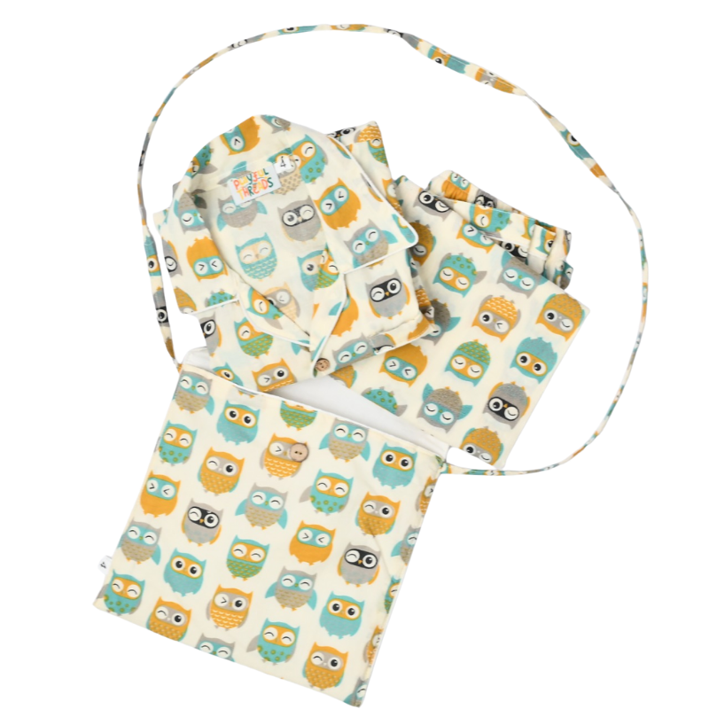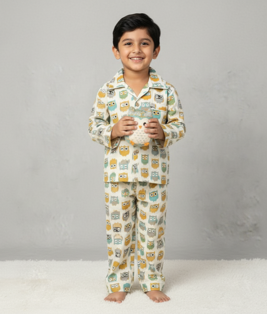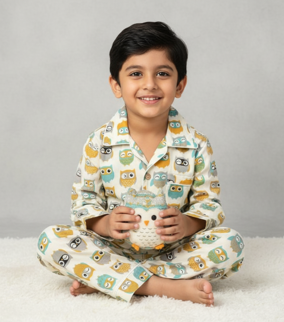 Make bedtime a hoot with our adorable Owlicious Night Suit Set! This classic two-piece pajama set features a delightful, all-over print of colorful owls in cheerful shades of mustard yellow, soft teal, and earthy green on a creamy white base.