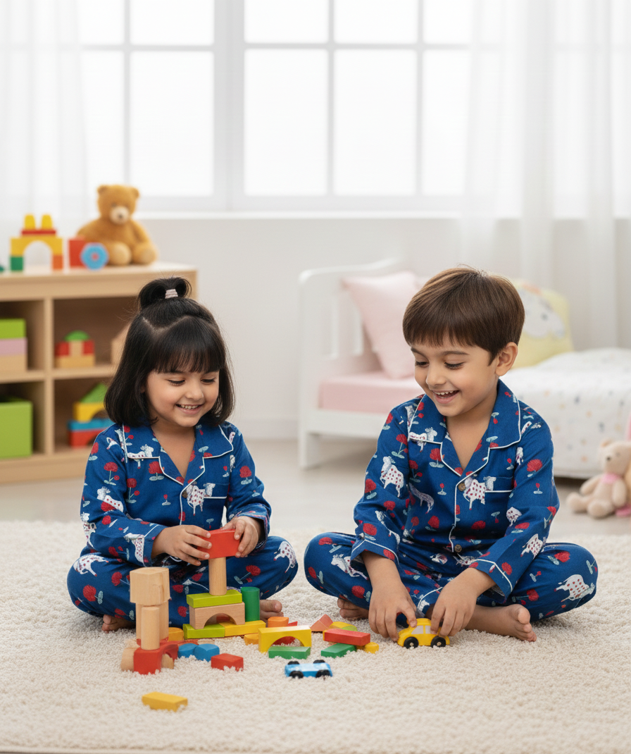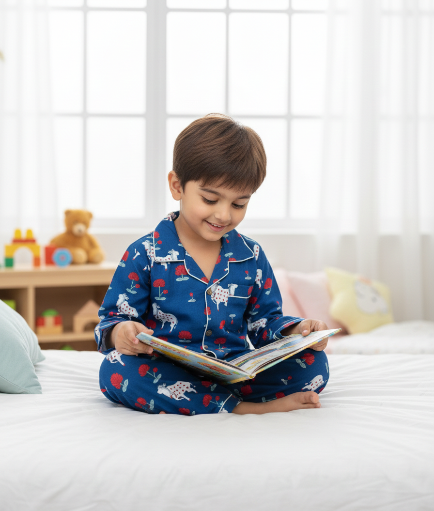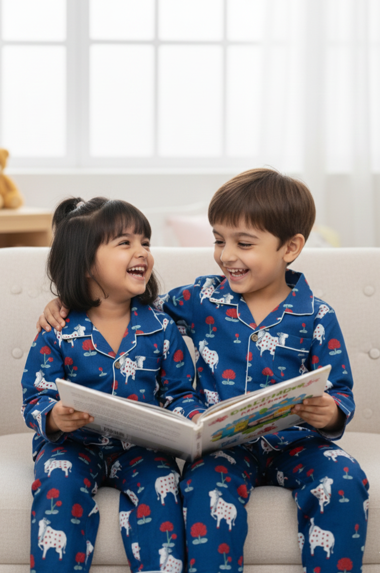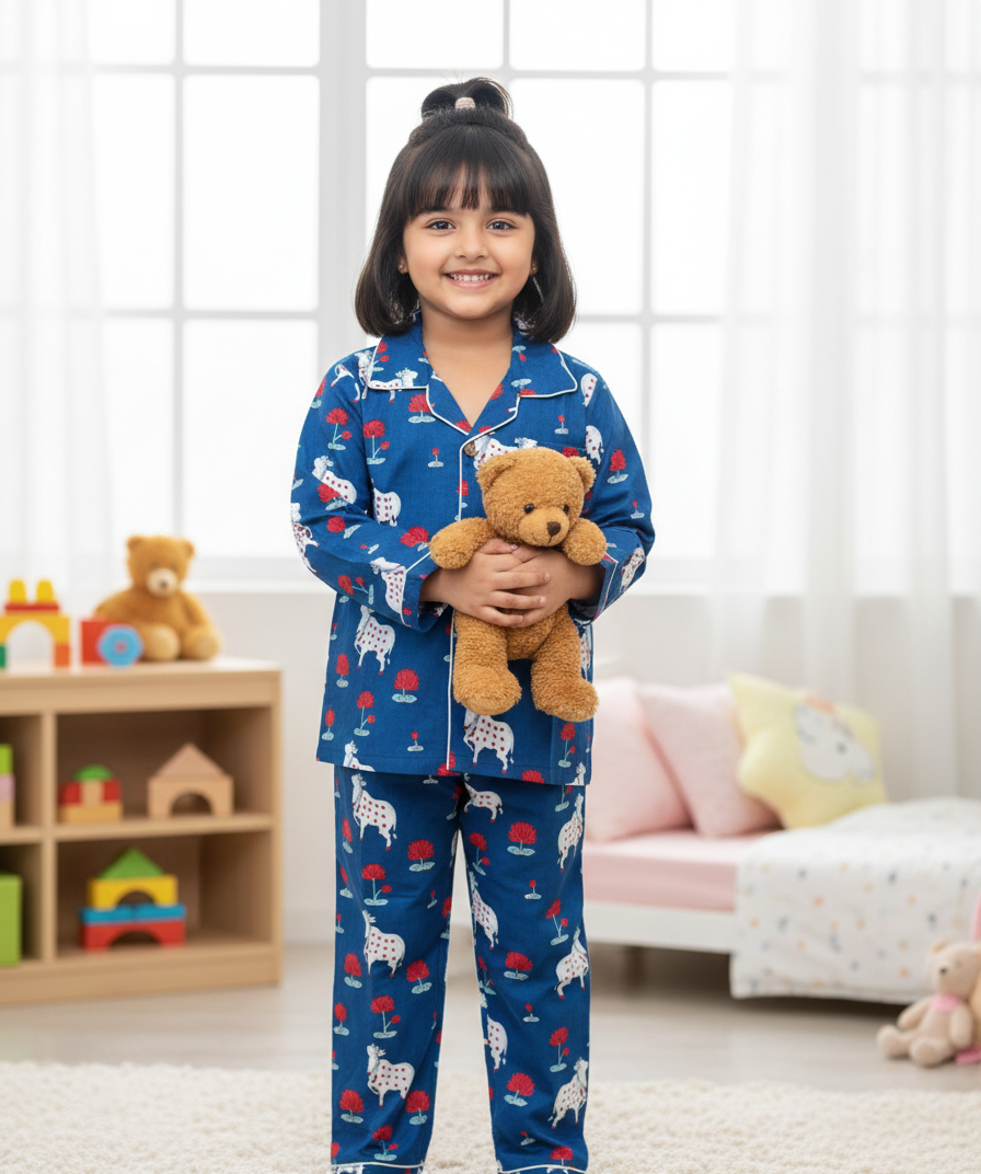 Introduce a touch of cultural charm and serene comfort to your little one's bedtime routine with The Royal Dreamer Night Suit. This unique pajama set features a beautiful hand-block-inspired print on a deep royal blue background.
