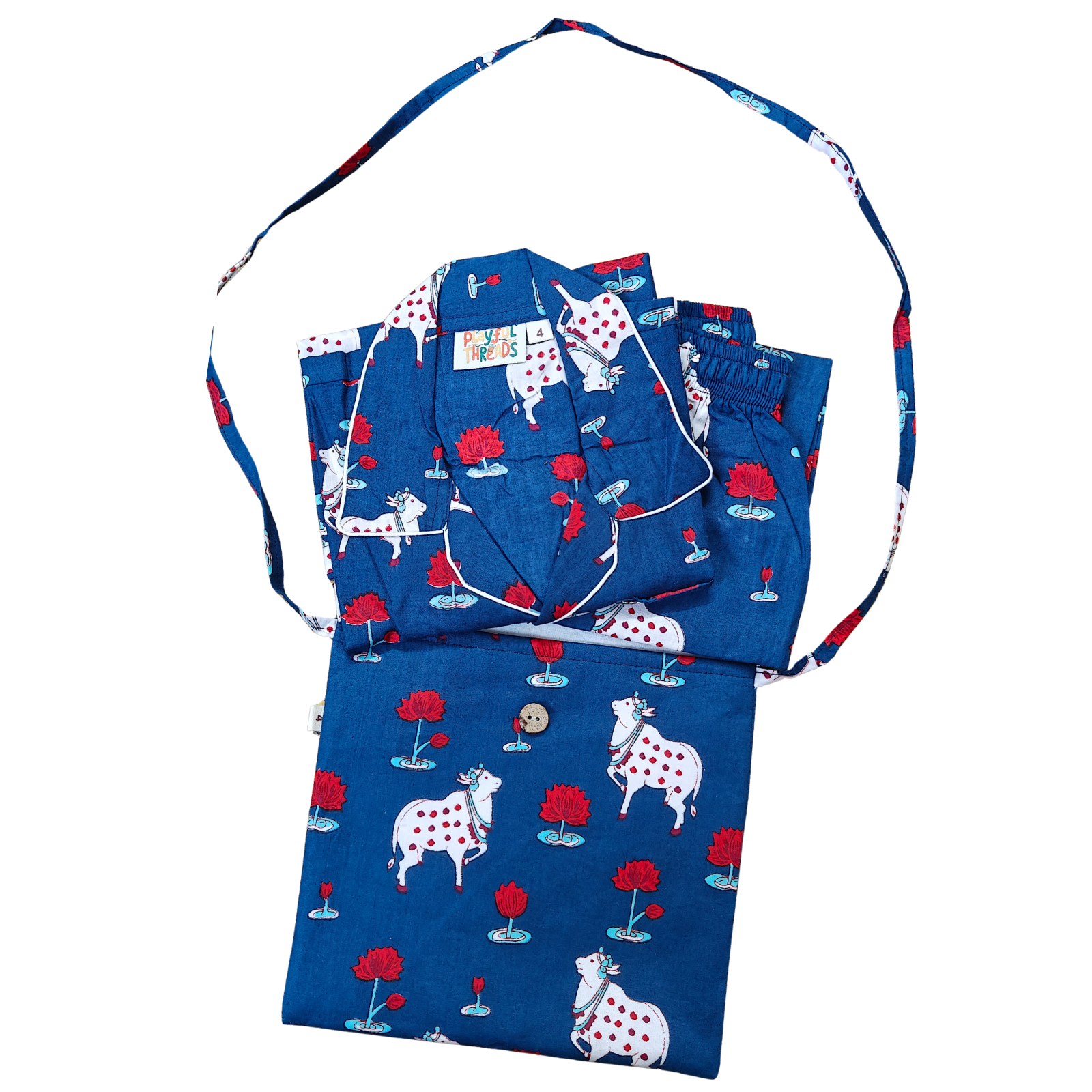 Distinctive Print: Features an enchanting pattern of sacred cows and lotus flowers on a rich blue base.