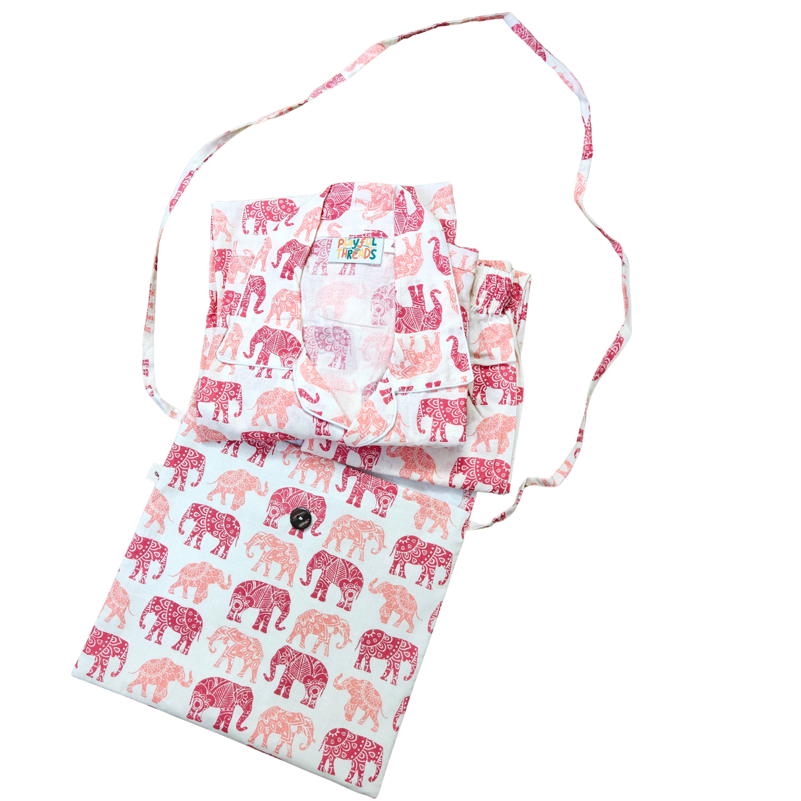 Includes: Full-sleeve button-down shirt, adjustable pajama pants, and matching sling bag.